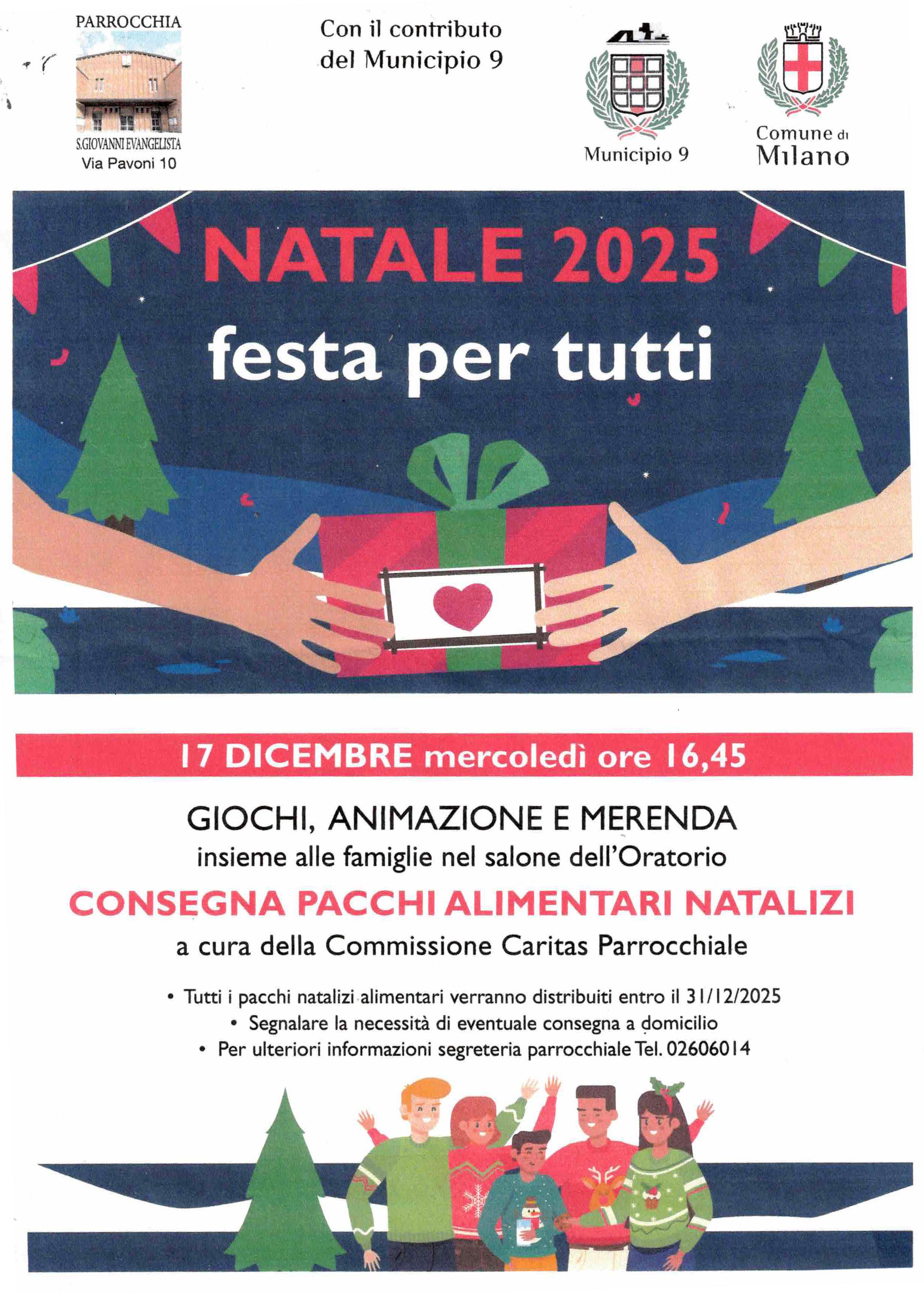 Tutti i pacchi verranno distribuiti entro il 31/12/2025 Segnalare la necessità di eventuale consegna a domicilio Per ulteriori informazioni segreteria parrocchiale 02606014